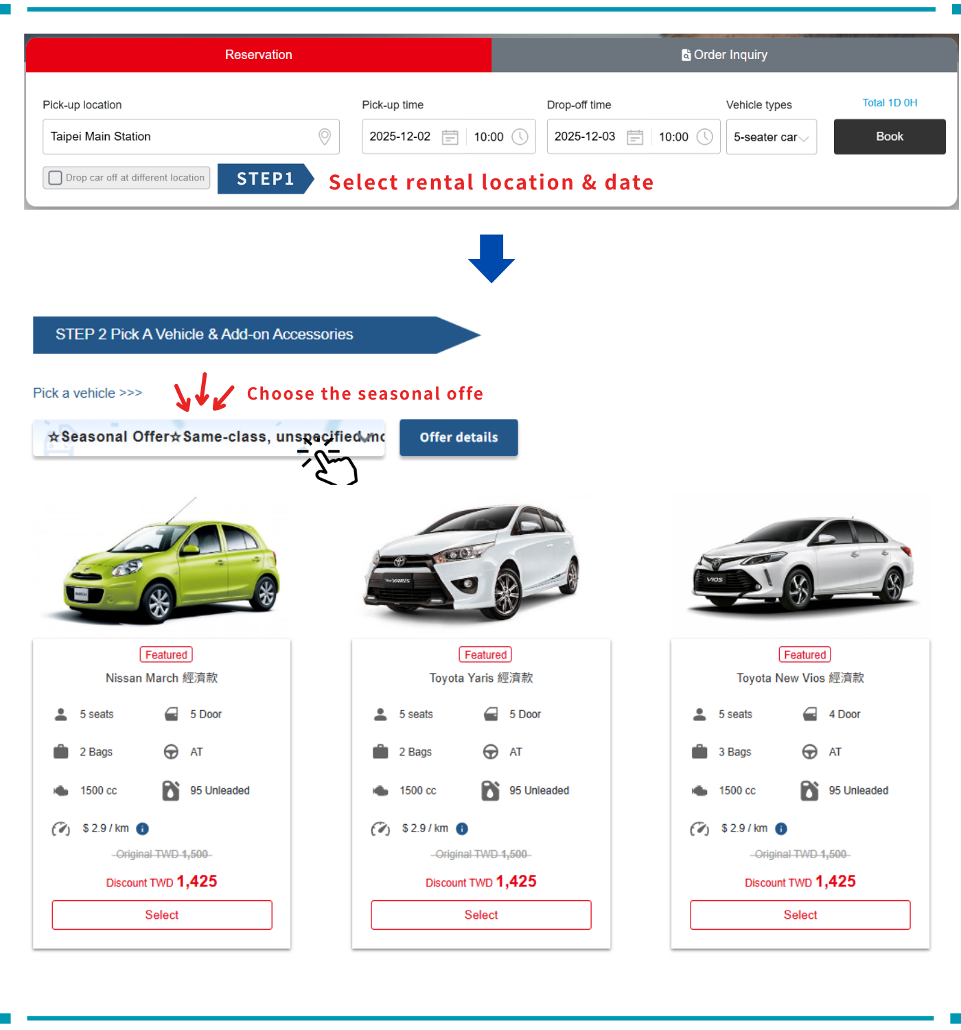 2.It is not valid for consecutive 3 days or longer holidays, and cannot be combined with other promotions. All prices include taxes and insurance fees.